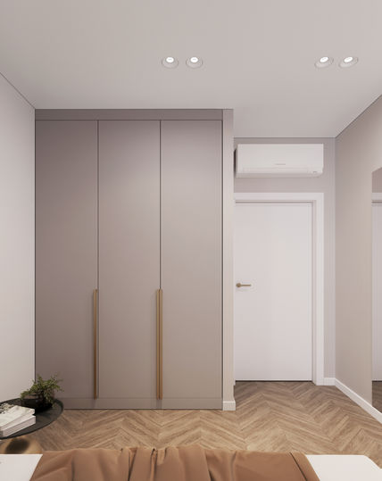 Світлий, майже білий інтер'єр в поєднанні з активними текстурами керамограніту, медово-горіхової підлоги, та деталями в золотому кольорі.