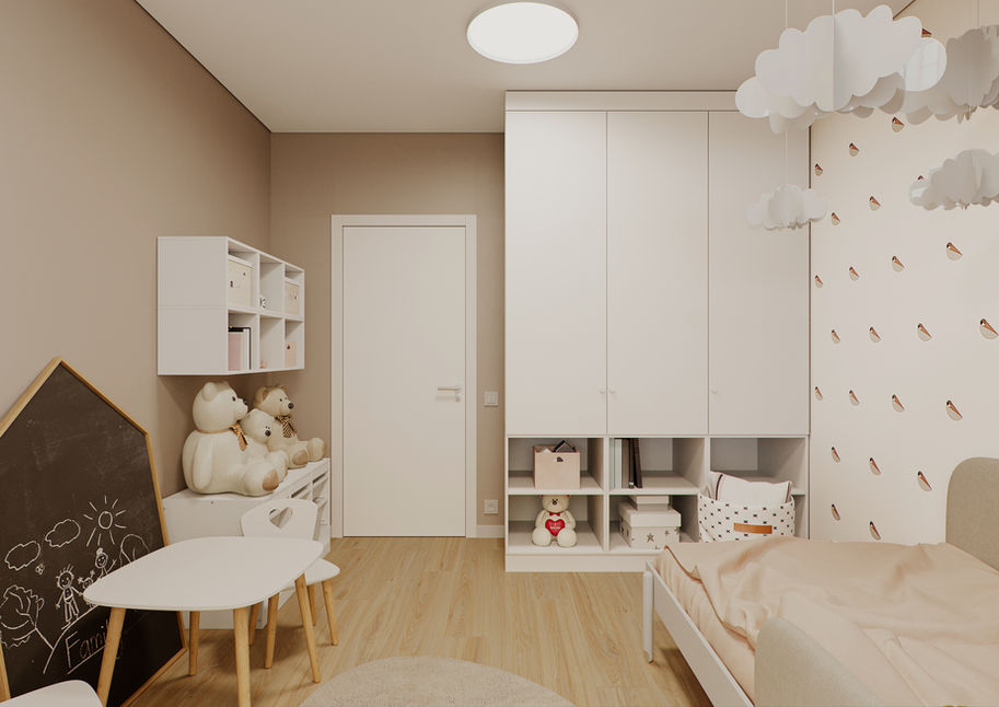 Soft, pastel shades, drowning textiles and brass accents are the design concept of this apartment. This design was created for a young family with a little girl, so it was important to provide plenty of storage space and practicality in the materials.